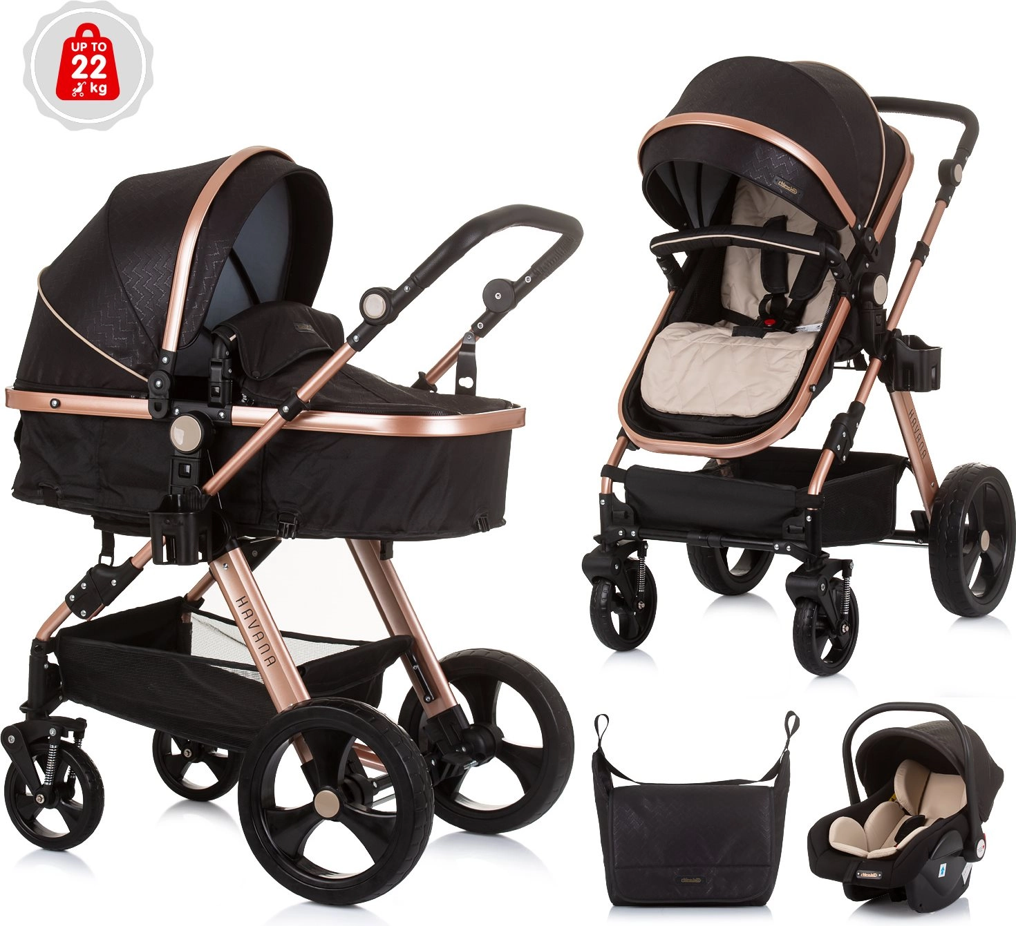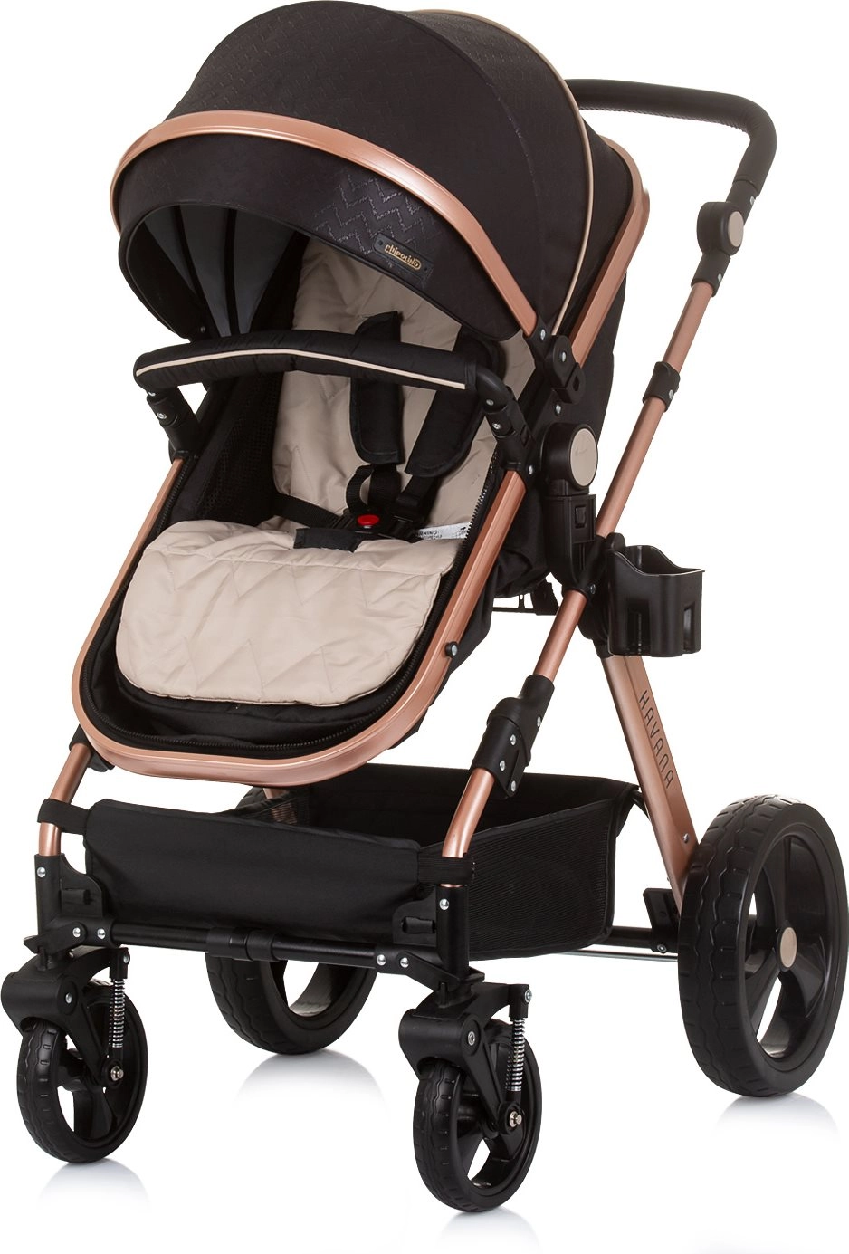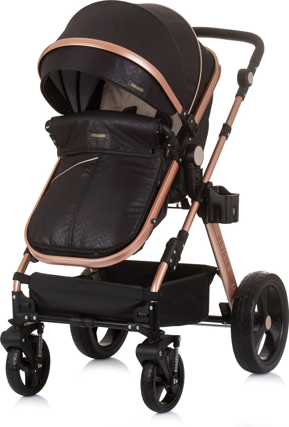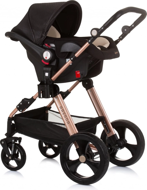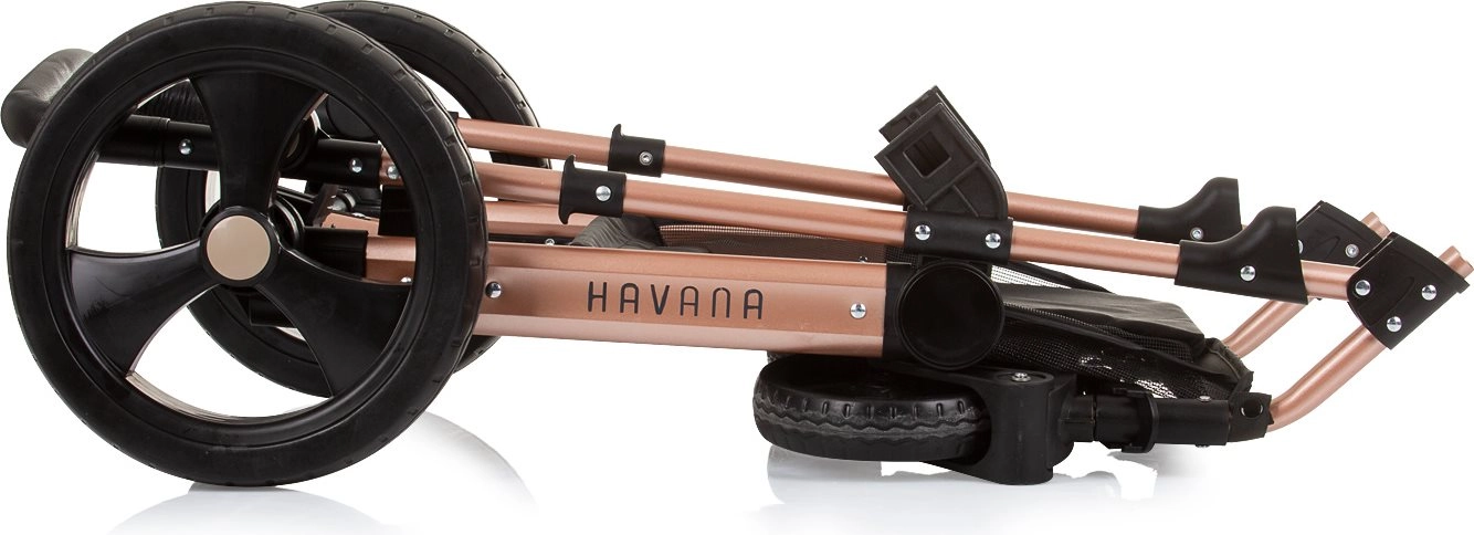 Lichte en elegante kinderwagen CHIPOLINO Havana 2-in-1 voor kinderen tot 22 kg. Omkeerbaar zitje, geveerde wielen, grote kap, rijke uitrusting en compact inklappen.
