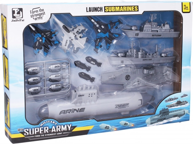 Deze aantrekkelijke set biedt een compleet maritiem avontuur in één verpakking. De hoofonderzeeër van 28 cm is uitgerust met een werkende torpedolanceerder en een terugtrekmotor voor dynamisch spel. De vloot wordt aangevuld met een vliegdekschip, een slagschip, een kruiser en drie straaljagers met vrijlopende wielen.