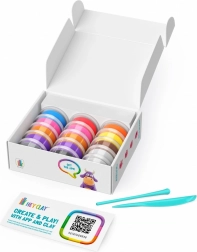 De set bevat 15 bekertjes zachte klei en digitale stap‑voor‑stap begeleiding in de app voor Android en iOS. Het materiaal is veilig voor kinderhuid en geschikt voor herhaald gebruik – bewaar ongebruikte klei eenvoudig in een luchtdicht afgesloten bekertje.