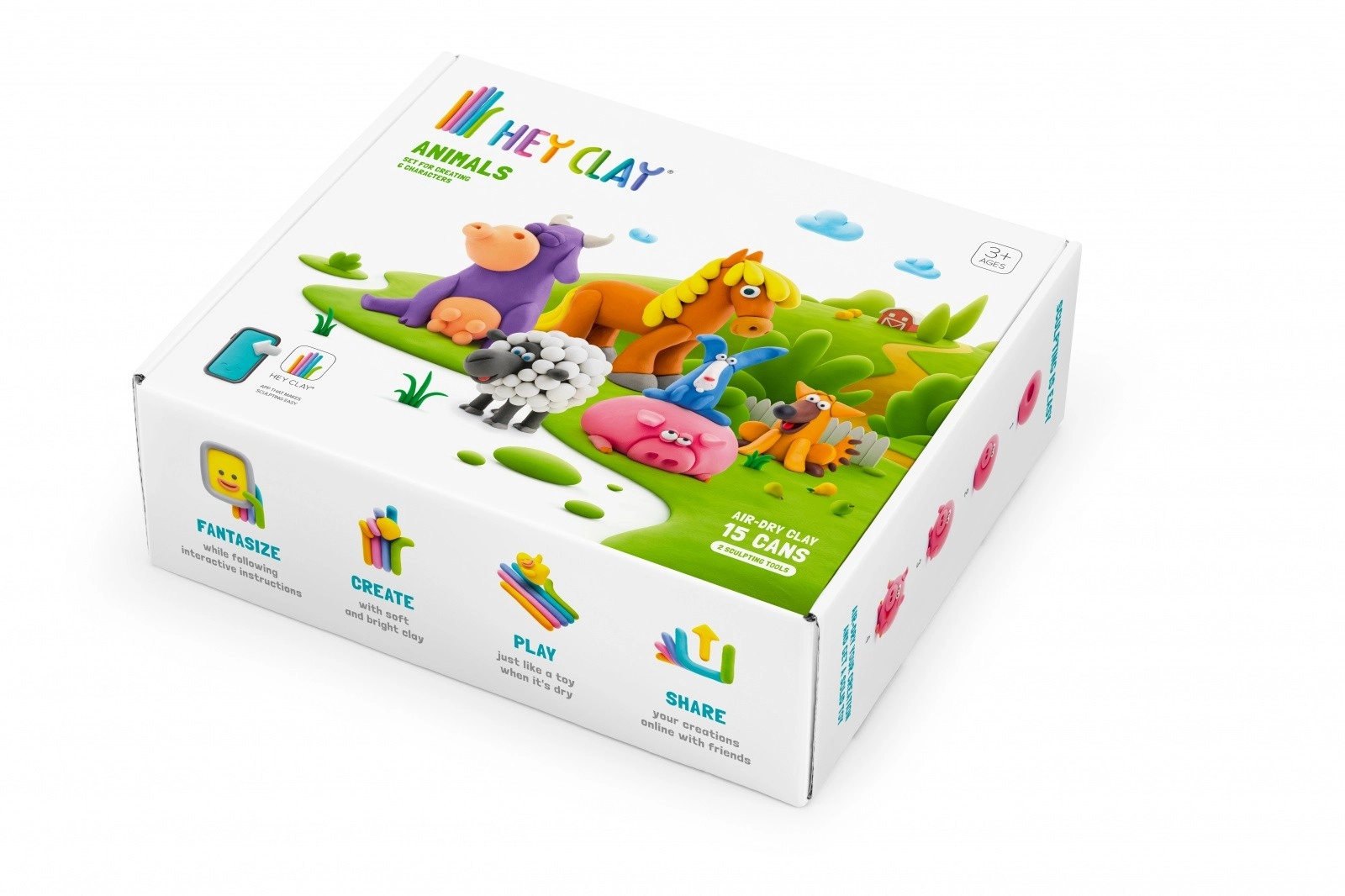HEY CLAY Dieren is een creatieve set voor kleine beeldhouwers. De lichte foam boetseerklei plakt niet, maakt niet vies en hardt aan de lucht uit zodra het kunstwerk af is, zodat kinderen hun figuurtjes kunnen bewaren. Dankzij het rijke kleurenpalet en de stapsgewijze instructies in de gratis app maken ze gemakkelijk tot 6 schattige dieren.