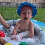 Geen tranen meer bij het uitspoelen van het haar. De kinderbadvizier leidt water effectief weg van het gezicht, beschermt de ogen tegen shampoo en zorgt voor een rustige, aangename badtijd. De ergonomische vorm bedekt het hoofd zonder onaangename druk en de zachte randen verhogen het comfort.
