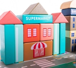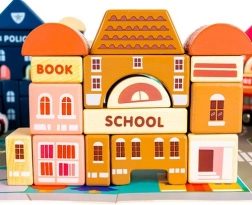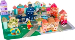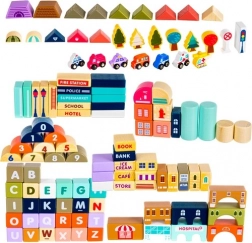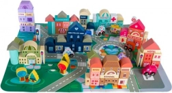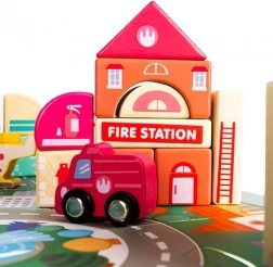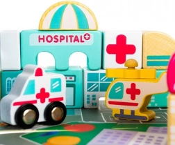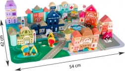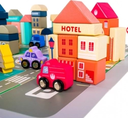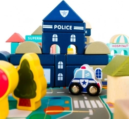 De rijke uitrusting omvat gebouwen zoals school, ziekenhuis, brandweerkazerne, politie, bank, boekhandel, supermarkt, museum en cafe9, en ook 7 voertuigen (politie, brandweer, ambulance, taxi, schoolbus, auto, helikopter). De houten elementen zijn zorgvuldig geschuurd, randen afgerond en verven niet-giftig – ideaal voor veilig kinderspel.