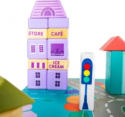 Bouw een complete stadsscène op de overzichtelijke puzzelondergrond van 54 × 42 cm. Kinderen kunnen straten plannen, gebouwen plaatsen en ontdekken hoe een stad functioneert. De set stimuleert oog-handcoördinatie, logisch denken en bevordert samen spelen met broers, zussen of vriendjes.