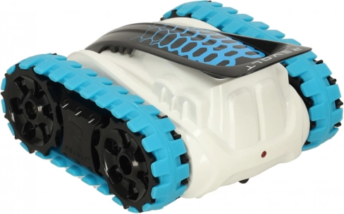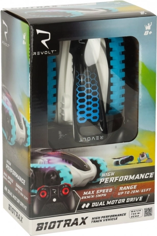 REVOLT BIOTRAX is een futuristisch rupsband RC-model dat uitblinkt in uitstekende terreinvaardigheid en stabiliteit op de meest uiteenlopende ondergronden. Het robuuste kunststof chassis en de brede rubberen rupsbanden zorgen voor geweldige tractie, zodat je kunt genieten van vloeiend rijden op tapijt, tegels en gras. LED-effecten benadrukken het agressieve design in blauw-witte uitvoering.