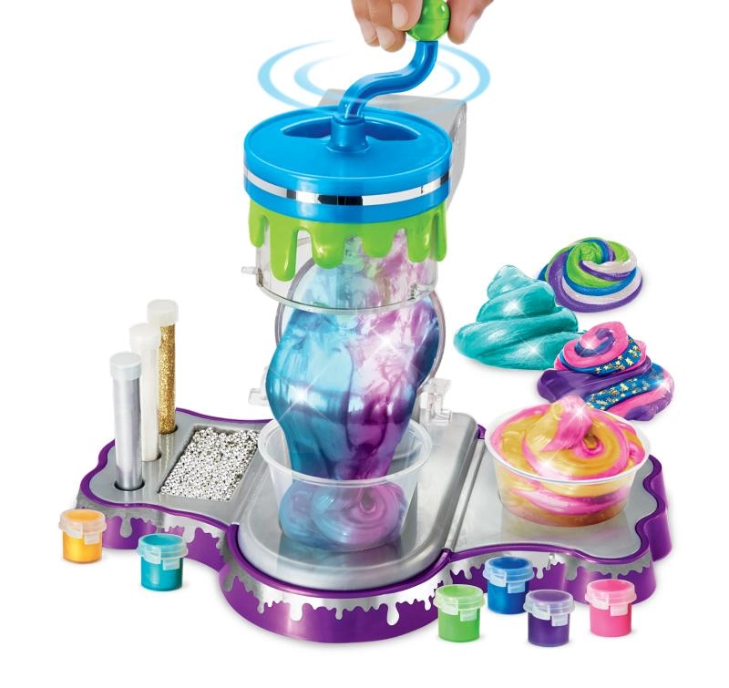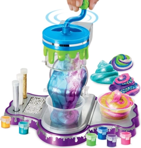 Voeg eenvoudig lijm, activator, kleurstoffen en glitter toe, draai vervolgens aan de slinger en zie hoe het slijm perfect wordt gemengd – zonder rommel en zonder batterijen.