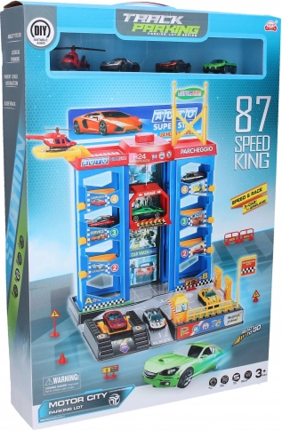 - 3 metalen auto’s, 1 metalen helikopter, handmatige lift, helikopterplatform, tankstation, slagboom