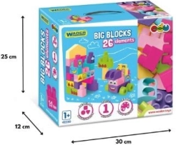 De set Wader grote blokken 26 stuks roze bevat 26 elementen in verschillende vormen en kleuren, die veel mogelijkheden bieden bij het bouwen. Kinderen kunnen ook gebruikmaken van kleurrijke stickers met cijfers, letters en afbeeldingen om structuren te versieren. De blokken zijn ontworpen voor gemakkelijk vastpakken en montage door kleine handjes. De variëteit aan vormen maakt het mogelijk om diverse constructies, voertuigen en figuren te creëren, waardoor de verbeelding en het creatieve denken van kinderen worden ontwikkeld.
