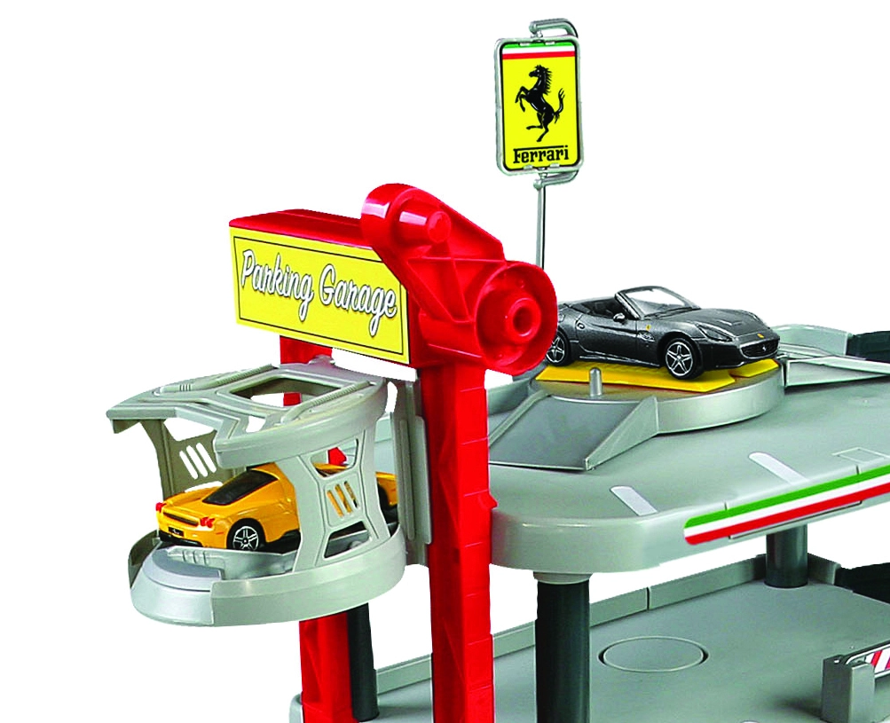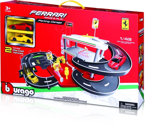- Rijke uitrusting: meerdere parkeerlagen, markeringen, accessoires en 2 metalen FERRARI’s 1:43.