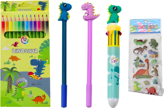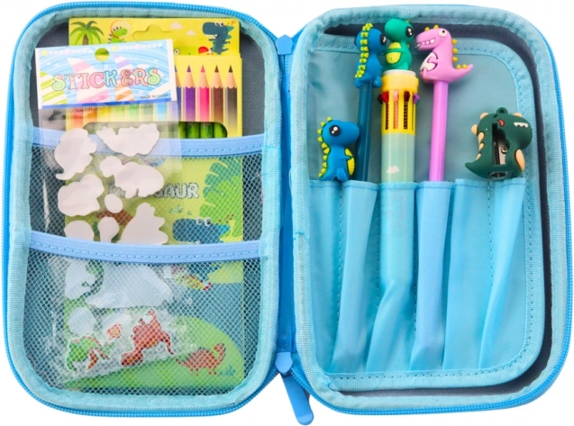 De set bevat bovendien twee pennen versierd met dinosaurusmotieven, die zeker favoriet zullen worden bij elke jonge fan van deze fascinerende wezens. De etui bevat ook een puntenslijper, een dop voor de pen in de vorm van een dinosaurus en gekleurde stickers met dinosaurusmotieven, waarmee schriften, boeken of de etui zelf versierd kunnen worden, zodat hij nog unieker wordt.