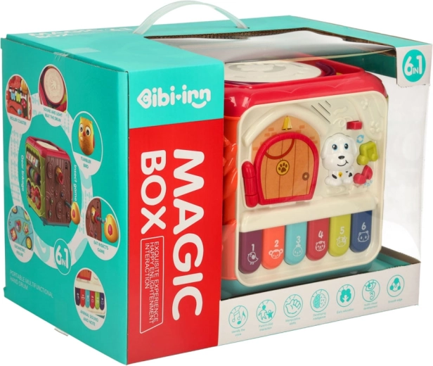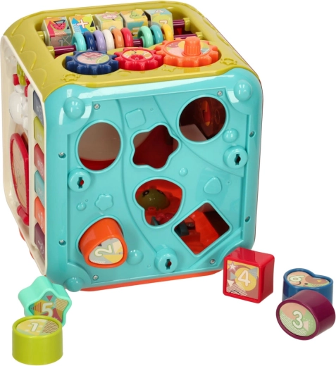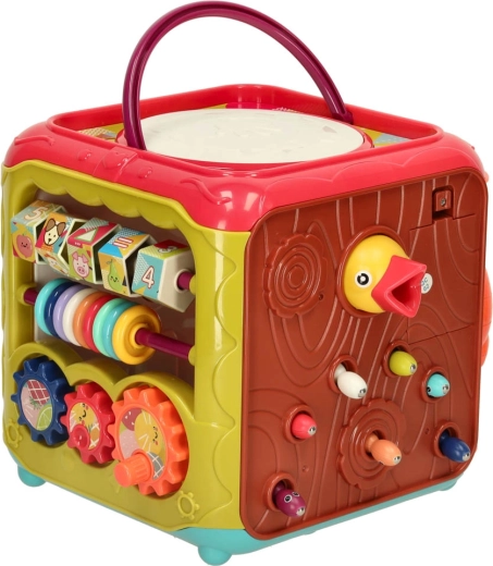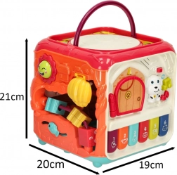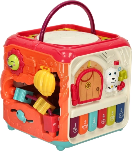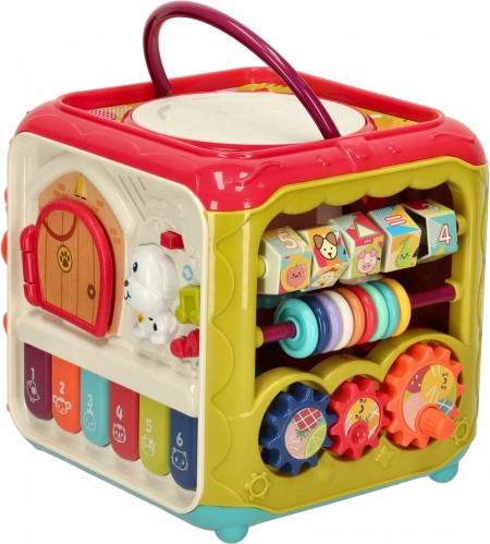 De 6-in-1 educatieve kubus is een speels centrum voor de kleinste ontdekkers. Elke zijde verbergt een andere activiteit die de zintuigen stimuleert en vaardigheden ontwikkelt bij kinderen vanaf 18 maanden. Van realistische dierengeluiden op de piano en openende deurtjes met bewegende elementen tot vormsorteren en draaiende tandwielen – het kind traint zowel handjes als hoofdje.