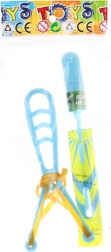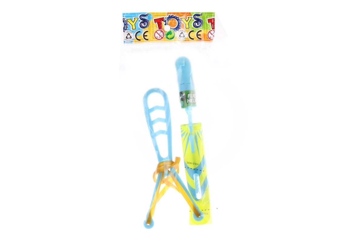 Kunststof katapult met een wegschietend vliegtuigje. Het vliegtuigje heeft een lampje op AG13-batterijen, die bij de verpakking zijn inbegrepen. Verpakt in een zakje. Afmetingen van de verpakking ca. 9x21x2 cm. Leeftijd 3+