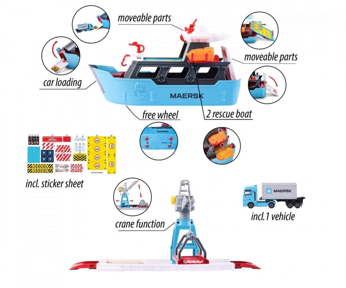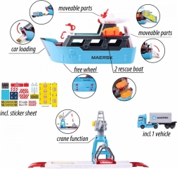 - Realistische functies en bewegende delen - net als op een echt vrachtschip worden containers en zelfs hele auto’s aan boord gehesen met een handbediende kraan. Het voertuig heeft ook een uitklapbare laadklep.