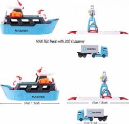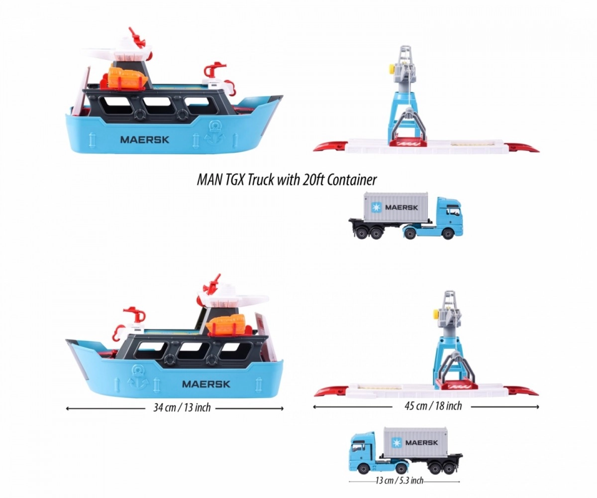 - Gelicentieerde speelgoedhaven Majorette Creatix met MAN TGX vrachtwagen met container - het Maersk-logistiekstation verandert de kinderkamer in een mum van tijd in een vrachtoverslaghaven en houdt kinderen bezig met het lossen van trucks en het vervoeren van goederen van het schip.