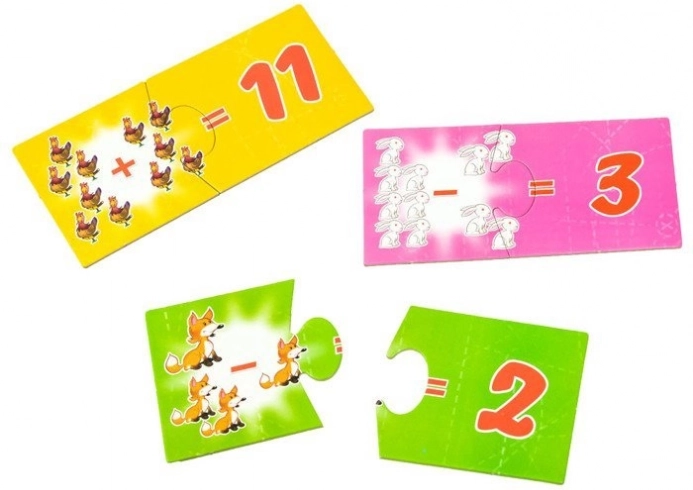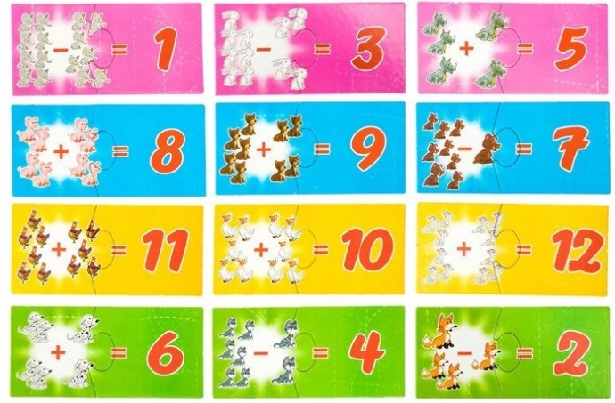 - 24 puzzelstukjes (12 paren) met dieren, cijfers en uitkomsten