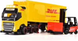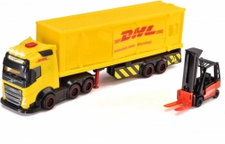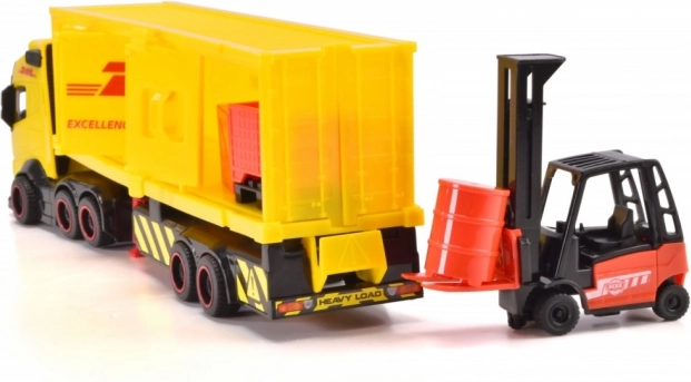 Ontdek de realistische VOLVO-vrachtwagen met aanhanger van DICKIE TOYS met officiële DHL-licentie, lengte 35 cm. Inclusief een rode heftruck en laadboxen voor authentiek logistiek spel. Het voertuig biedt licht- en geluideffecten, openende en bewegende delen en een robuuste constructie voor spelen binnen, buiten en in het zand.
