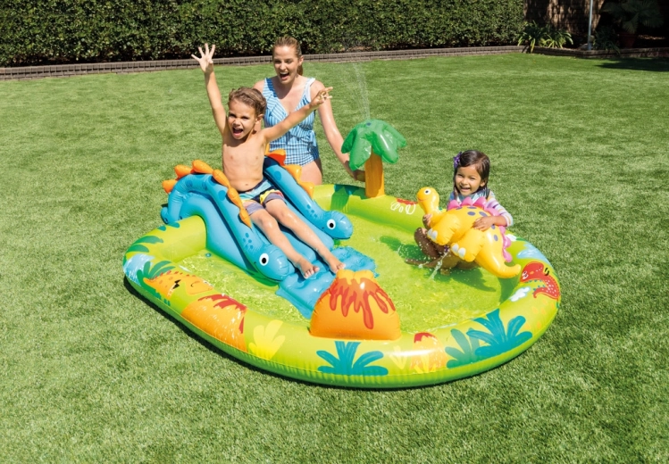 Dit opblaasbare badje met een origineel dinosaurusdesign zorgt voor veel plezier in de tuin. Kinderen zullen zich vermaken met glijden en spelen met de dinosaurusfiguren, terwijl de ingebouwde palmsproeier voor extra waterverfrissing zorgt.
