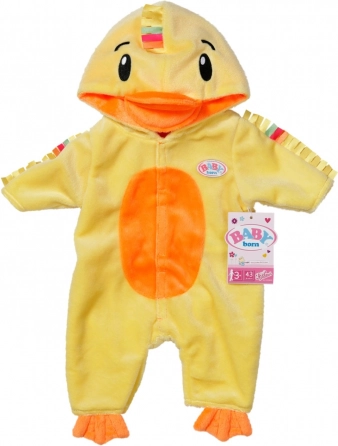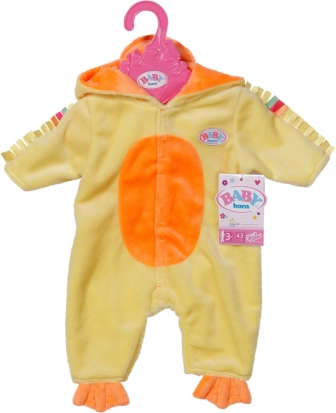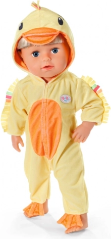 De zachte eenden-onesie voor BABY born-poppen van 43 cm verandert spelen in een knuffelig avontuur. De capuchon met snaveltje, het contrasterende oranje buikje en de “zwem”-voetjes zorgen voor een schattige look, terwijl de rits aan de voorkant het omkleden en het oefenen van fijne motoriek vergemakkelijkt.