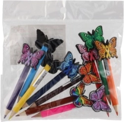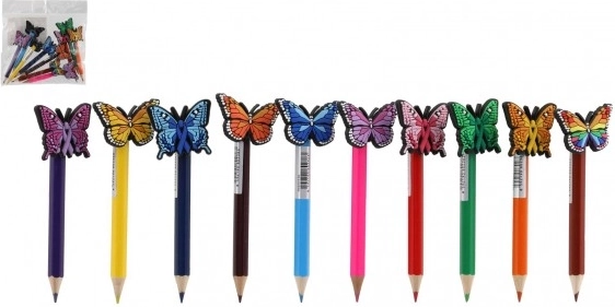 Deze set bevat 10 potloden in verschillende kleuren, elk met een vlinderversiering aan de top. De decoraties voegen een speels en decoratief element toe aan de potloden, waardoor ze ideaal zijn voor kinderen of creatief schrijven. De kleurrijke vlinders brengen een vleugje fantasie naar uw schrijven en tekenen.