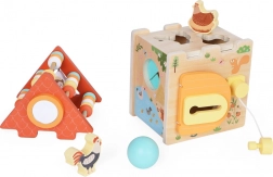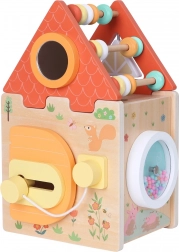 Dit speelgoed is ideaal voor de ontwikkeling van kinderen, omdat elke kant van het huisje een nieuw avontuur verbergt. Of het nu gaat om invoegen, schuiven of sloten. De kubus bevat ook een telraam dat als dak van het huisje dient.