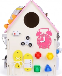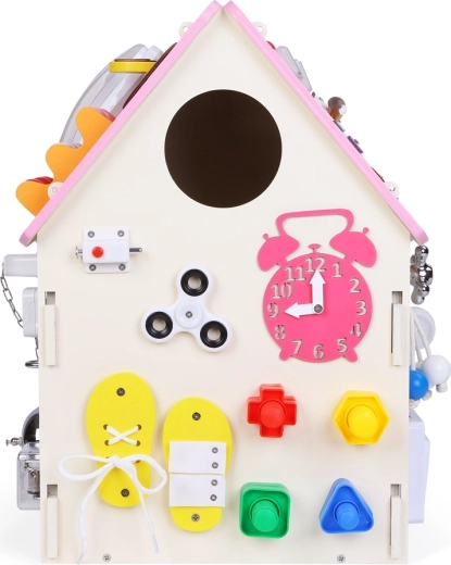 Ontdek het rijk uitgeruste activity board huisje dat spel en leren in één combineert. Dankzij de uiteenlopende mechanische elementen – sloten, riempjes, veters, wielen en schakelaars – verfijnen kinderen hun fijne motoriek en logisch denken, terwijl ze creativiteit en nieuwsgierigheid ontwikkelen.
