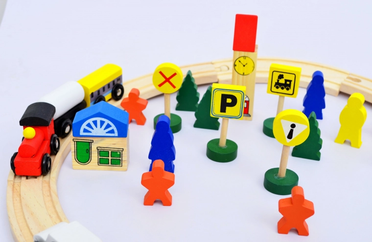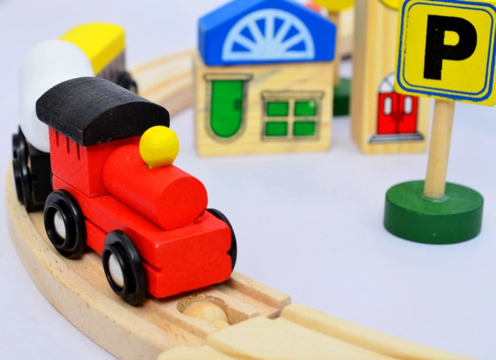 - Houten rails, treintje met magnetische wagonnetjes, figuurtjes, auto, gebouw, verkeersborden