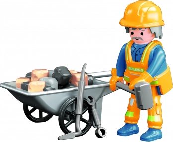 - Bevat een figuurtje van een bouwvakker, kruiwagen, lading en gereedschap
