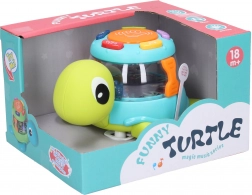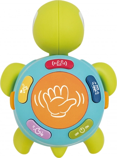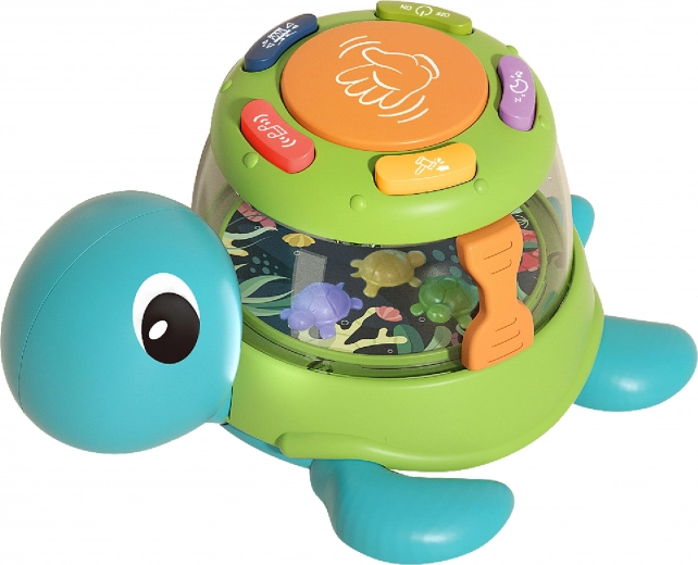 Leuke kinderdrum in de vorm van een schildpad met kleurrijk design, licht- en geluidseffecten en een ON/OFF-knop. Ideaal speelgoed voor de ontwikkeling van ritme en motoriek bij kinderen vanaf 18 maanden. Inclusief 2× AAA-batterijen.