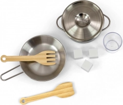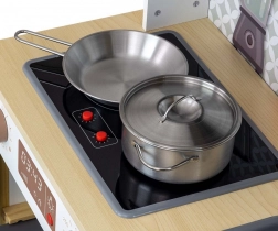 Inhoud van de set: metalen koekenpan, pan met deksel, houten spatel en vork, doorzichtige beker en 3 ijsblokjes. Het keukentje groeit mee dankzij verstelbare verlengstukken voor de pootjes, waardoor het jarenlang speelplezier biedt.