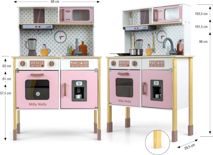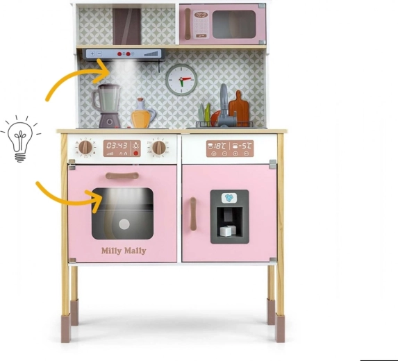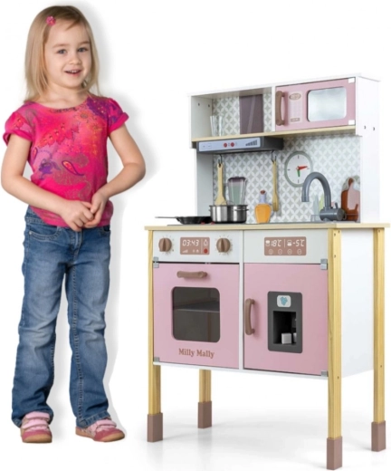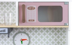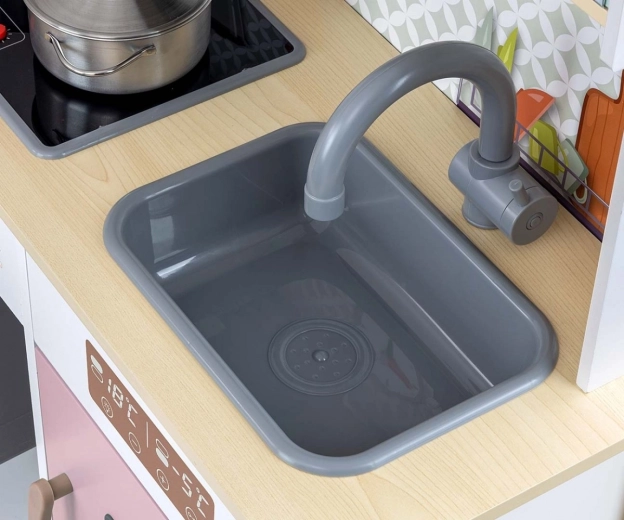 Onderdeel is een oven met doorzichtig raampje, magnetron, koelkast met realistische ijsblokjesmaker en een enkelvoudige spoelbak. Op het paneel bevinden zich een afzuigkap met licht en geluid, verschuifbare haakjes voor accessoires en een klok met beweegbare wijzers om de tijd te leren. Illustraties van keukenelementen op de achterwand stimuleren de verbeelding en thematisch spel.