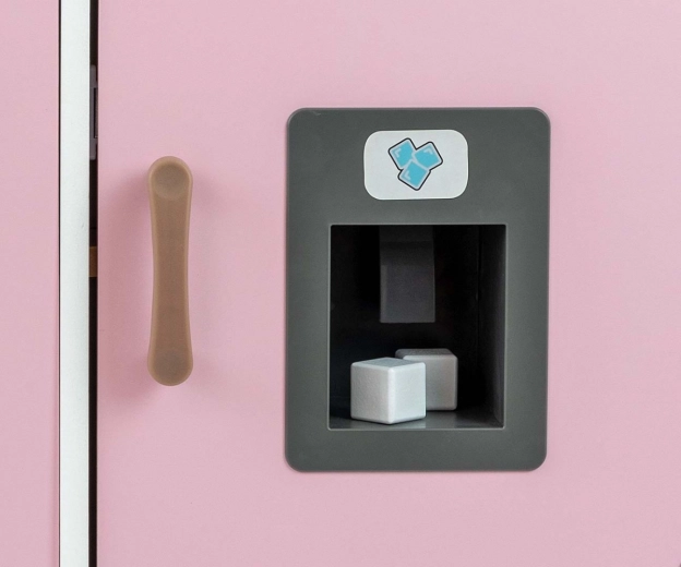 Kleine chefs zullen dol zijn op de koelkast met realistische ijsproductie, de doorzichtige beker en 3 ijsblokjes. Inclusief koekenpan, pan met deksel en houten keukengerei.