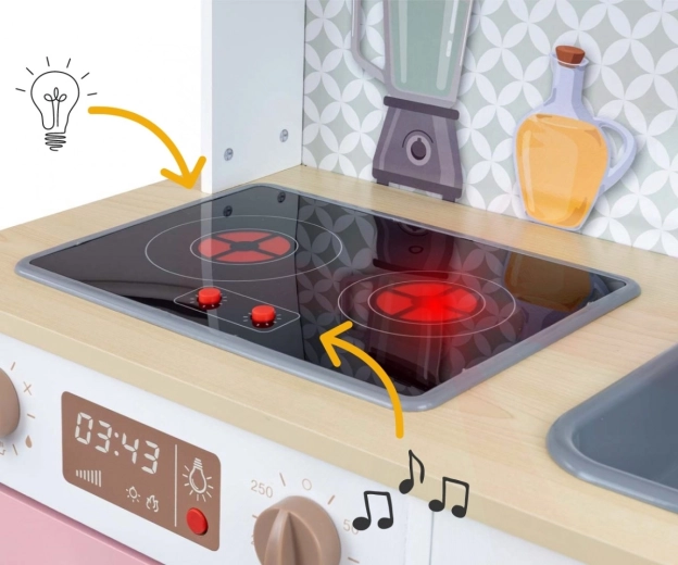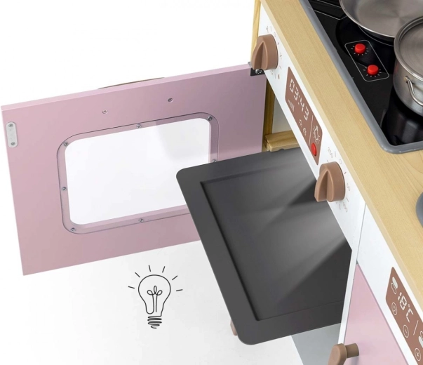 De kookplaat met kookgeluid en verlichting, de oven met licht en de klikbare knoppen bieden kinderen een echte kookervaring.