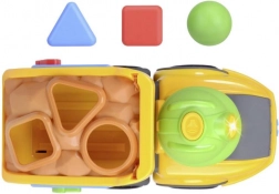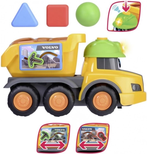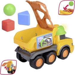 De gele Volvo-vrachtwagen met een vrolijk design en kleurrijke blokken voor de vormenstoof is ideaal voor de ontwikkeling van motorische vaardigheden.