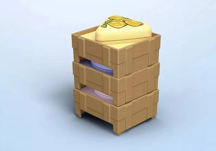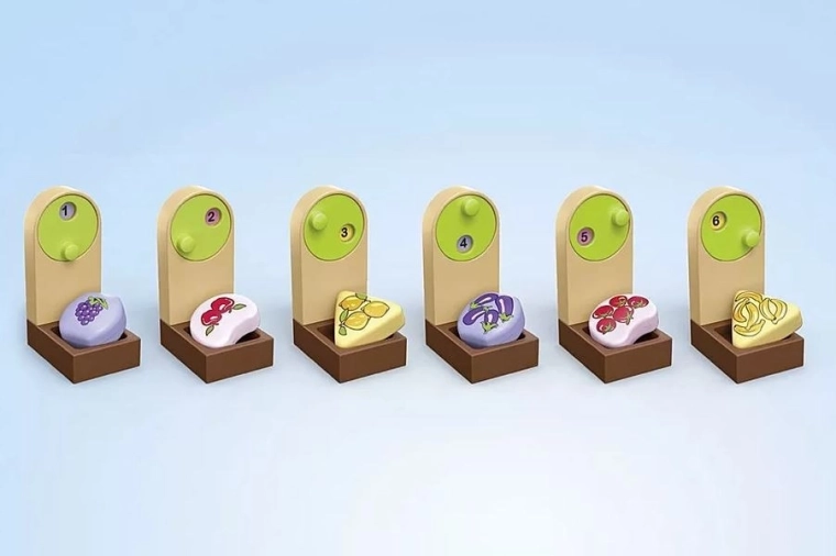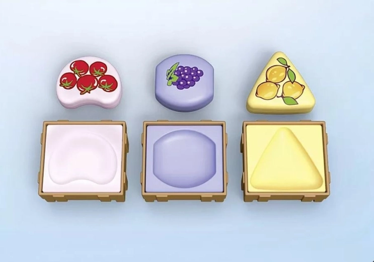 Dozen met gekleurde inzetstukken maken het mogelijk om fruit en groenten op kleur en vorm te sorteren, wat het visuele en cognitieve leren ondersteunt.