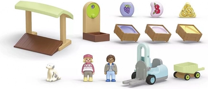 Op de duurzame markt valt voor jonge kinderen veel te ontdekken. De set bevat een heftruck, dozen met een brede variatie aan fruit en groenten, een weegschaal, een winkelmandje en een hond. Het speelgoed ondersteunt de ontwikkeling van motorische vaardigheden en het leren van kleuren, vormen en getallen in een speelse omgeving.