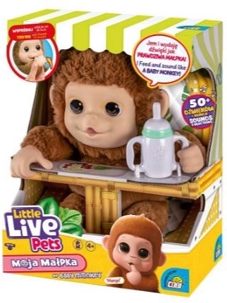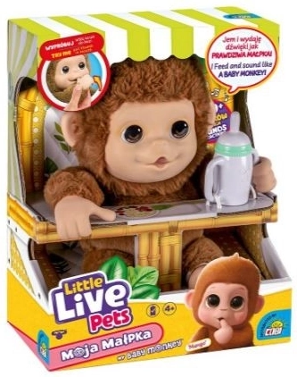 Een nieuw exotisch, zeer realistisch diertje uit de Little Live Pets-collectie. Het speelse aapje Mango houdt van stoeien. Meer dan 50 geluiden en reacties maken jullie spelletjes samen extra bijzonder. Ze ziet eruit en gedraagt zich net als een echte aap en haar favoriete spel is zich vastgrijpen en met haar hoofd omlaag hangen! Mango herkent bovendien in welke positie ze zich bevindt! Haar gezicht beweegt heel realistisch wanneer ze praat, eet of op haar duim sabbelt. Gooi haar in de lucht en ze lacht vrolijk, maar let op: ook een aapje heeft weleens genoeg. Als je haar te lang omhoog gooit, wordt ze duizelig. Dan kun je haar op haar buikje kietelen en steekt haar vrolijke lach aan.