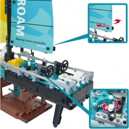 Bedien het roer en de besturing, werk met de lier en pas de stand van de zeilen aan. Mechanische elementen zorgen voor interactief bouwen én spelen.