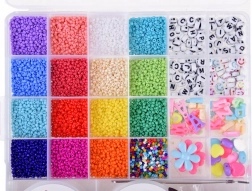 Maak je eigen kleurrijke armbanden, kettingen en hangers met deze uitgebreide kralenset in een praktische organizer. Je vindt er letterkralen, hartjes, bloemetjes en kleine kralen in vele tinten – alles voor unieke en gepersonaliseerde sieraden. De set stimuleert creativiteit en fijne motoriek en is dankzij de eenvoudige hantering ideaal voor kinderen en beginners.
