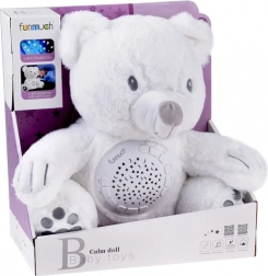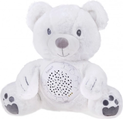 Deze zachte witte teddybeer combineert een speelgoedknuffel en nachtlampje in één. Dankzij 6 zachte slaapliedjes en 5 authentieke natuurgeluiden helpt hij je kleintje te kalmeren en een gevoel van geborgenheid te geven. De kleurrijke projector met sterren en maan creëert op muren en plafond een rustgevende sfeer die het schemerdonker verdrijft en een goede nachtrust ondersteunt.