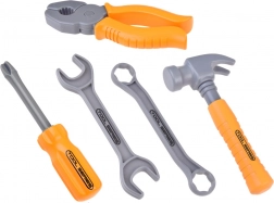 De set bevat een hamer, sleutels, schroevendraaier, schroeven, moeren en bouwonderdelen – ideaal om fijne motoriek te oefenen en creatief te bouwen.
