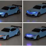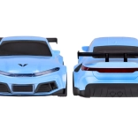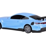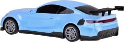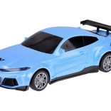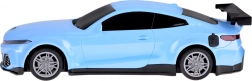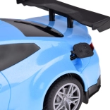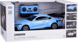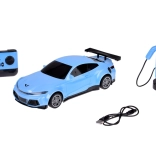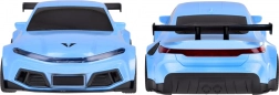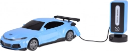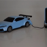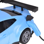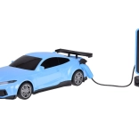 Blauwe RC-raceauto met realistische details en een laadstation zoals bij echte elektrische auto's, perfect voor elke kleine snelheidsfanaat. Biedt rijden vooruit/achteruit, sturen rechts/links, automatisch parkeren, lichteffecten in 5 modi en claxon- en muziekgeluid. In de doos zitten een oplaadbare batterij voor auto en station en een controller met intuïtieve bediening.