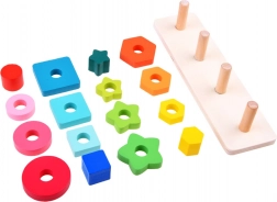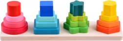 Het houten leerspel met vier staafjes biedt slimme pret voor kinderen: ze sorteren en stapelen vormen (cirkels, vierkanten, sterren enz.), leren kleuren kennen en combineren volgens voorbeelden of eigen fantasie. Dankzij de gladde afwerking en verzadigde kleuren voelt het spel prettig aan en nodigt het uit tot verder ontdekken.