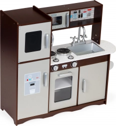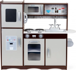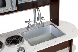 Net zoals in een echte keuken hebben kinderen de mogelijkheid om te bakken, koken en voedsel op te warmen in de magnetron en vervolgens al het servies af te wassen in de ruime gootsteen en alles op te ruimen.