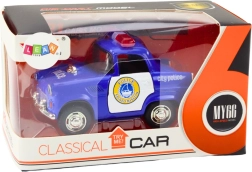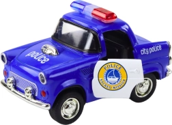De klassieke politieauto in een elegante blauwe kleur is een perfecte replica van echte politievoertuigen en spreekt zowel kinderen als volwassenen aan. Hij beschikt over frictie-aandrijving die, na naar achteren trekken, snel vooruit schiet, waardoor realistische politieachtervolgingen of patrouilles kunnen worden gesimuleerd.