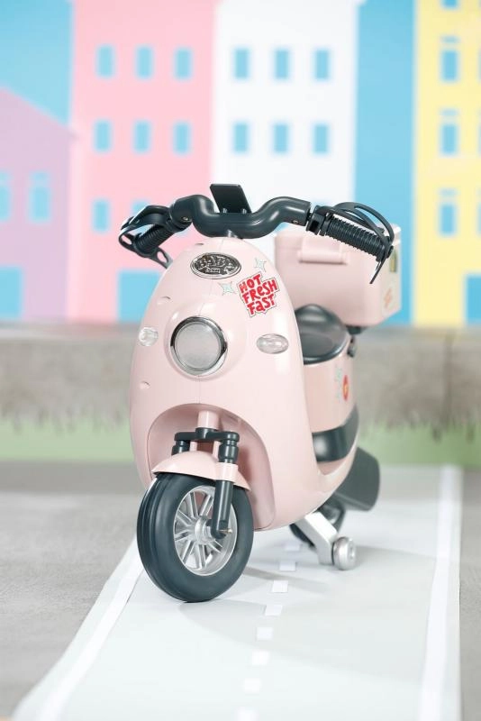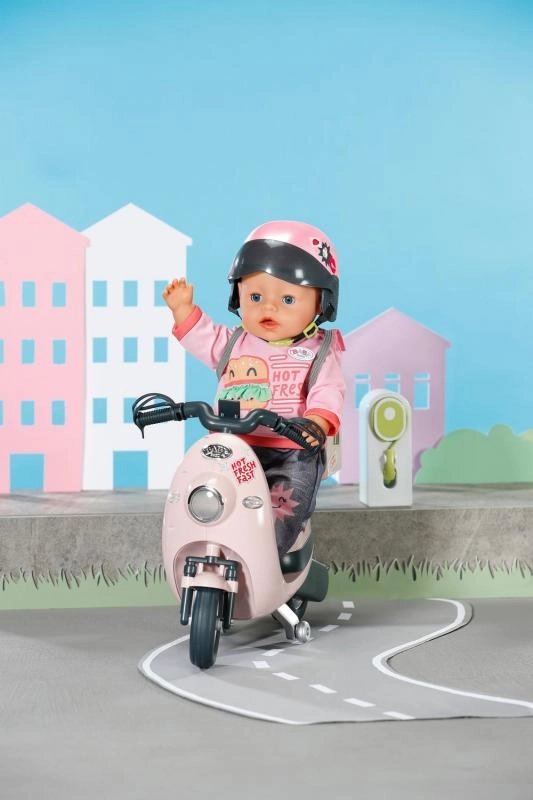 Deze roze elektrische scooter is de perfecte aanvulling voor creatief spel met de BABY born-pop. Kinderen kunnen de rijrichting eenvoudig bedienen met de afstandsbediening, terwijl realistische elementen zoals verlichting, standaard en functionele details de verbeelding en motoriek stimuleren.