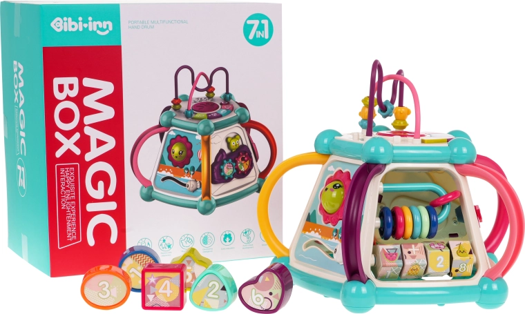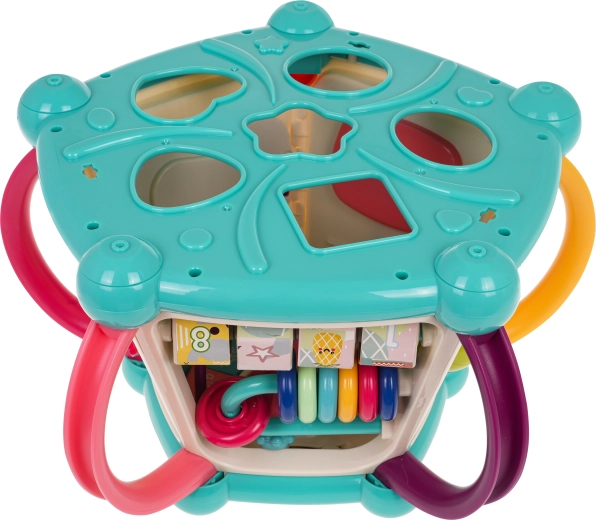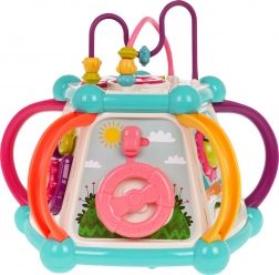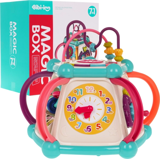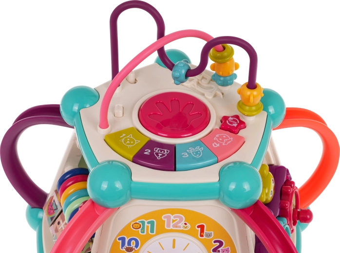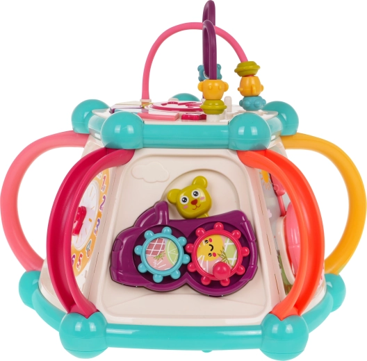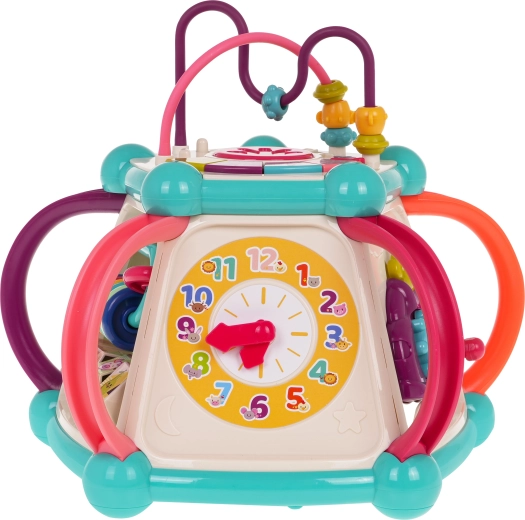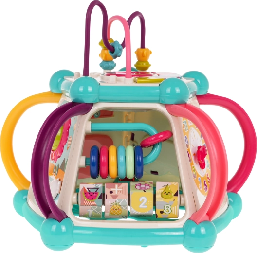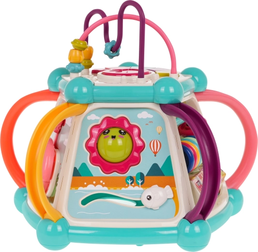 Deze kleurrijke multifunctionele kubus is gemaakt van hoogwaardige, veilige kunststof en is ideaal voor de eerste ontdekkingen. Zeven speelvlakken bieden diverse activiteiten: het bovenpaneel met een schuifpuzzel, tweestaps volumeregeling en een pianotje met geluiden van hondje, katje, schaapje en eendje; zijkanten met een telraam, klok met wijzers, tandwielen en een beertje, een stuur met autootje en een leuk visje met zonnetje. De onderkant verbergt een vormensorteeropening en 6 kleurrijke blokjes.