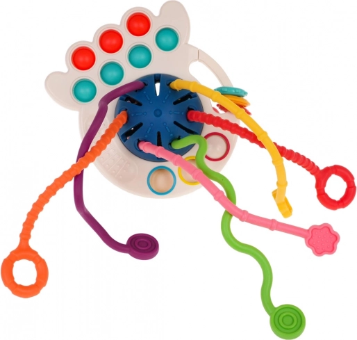 Ontdek het 4-in-1 zintuiglijk speelgoed in de vorm van een octopus voor kinderen vanaf 18 maanden. Het combineert rubberen koordjes om aan te trekken en op te bijten, de populaire POP IT-bubbels, schuifelementen en een rijgspel met kralen. Gemaakt van veilige materialen zonder scherpe randen, met levendige kleuren en bevestigbaar aan ledikant, kinderwagen of autostoeltje.
