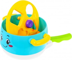 De set bevat een pan die fungeert als een vormensorteerder, wat een uitdaging biedt voor het kind en tegelijkertijd plezier in succes bij het oplossen. Het speeltje wordt gevoed door twee AA-batterijen (niet inbegrepen), wat langdurig speelplezier mogelijk maakt.