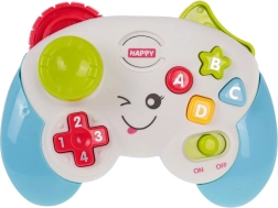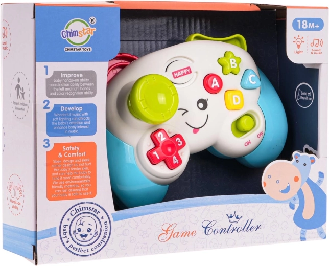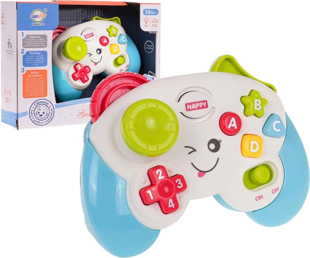 De controller heeft een witte behuizing met blauwe handgrepen en gekleurde knoppen, die de zintuigen van kinderen stimuleren en visueel entertainment bieden.