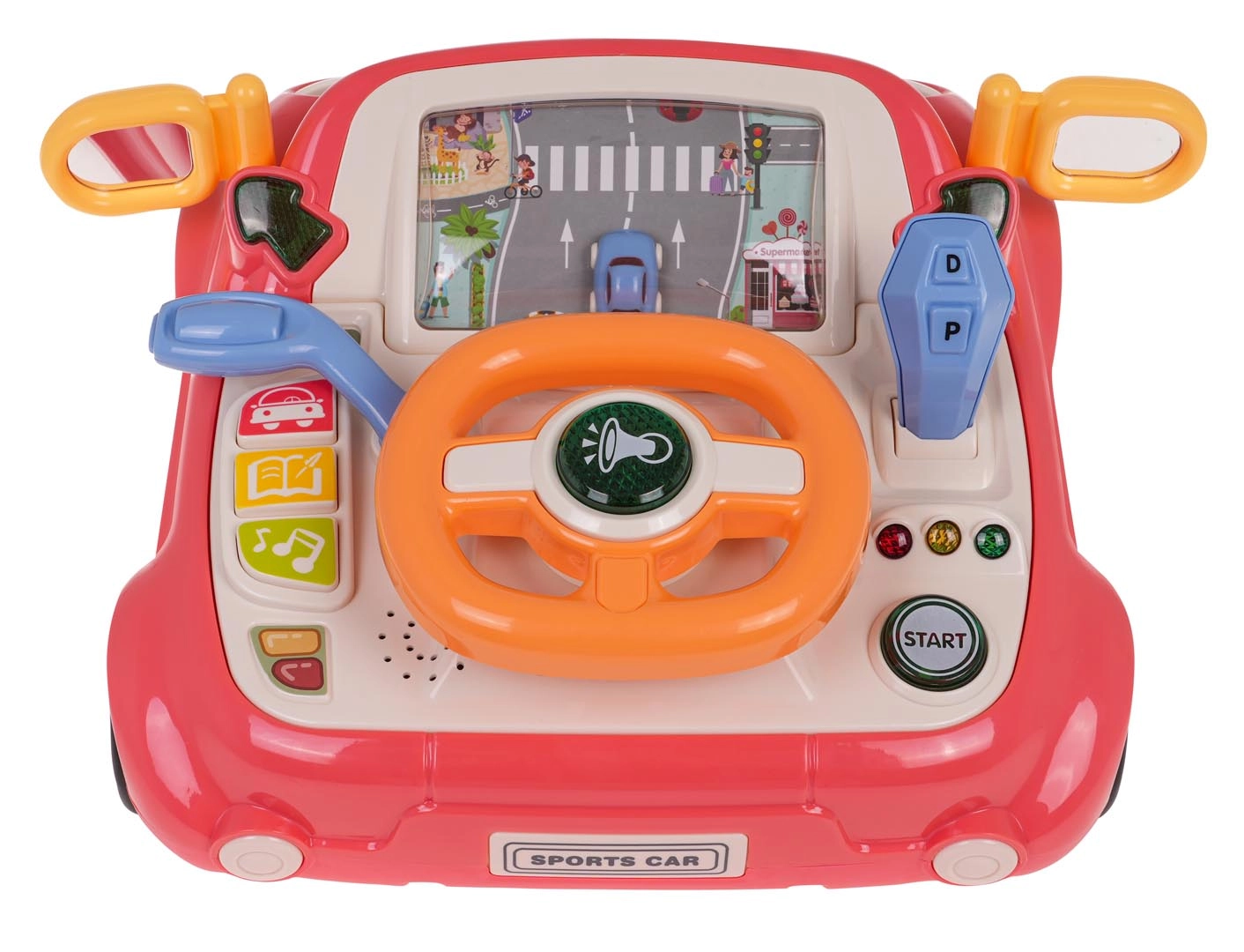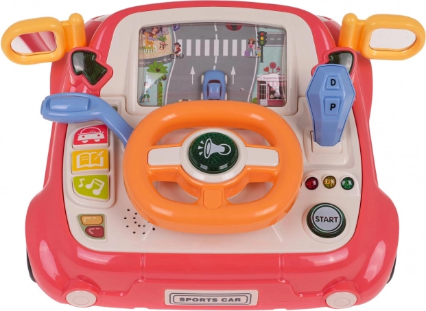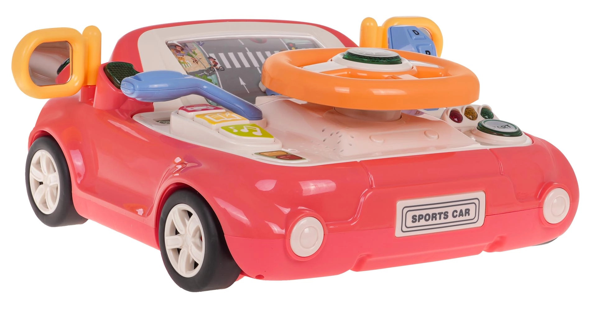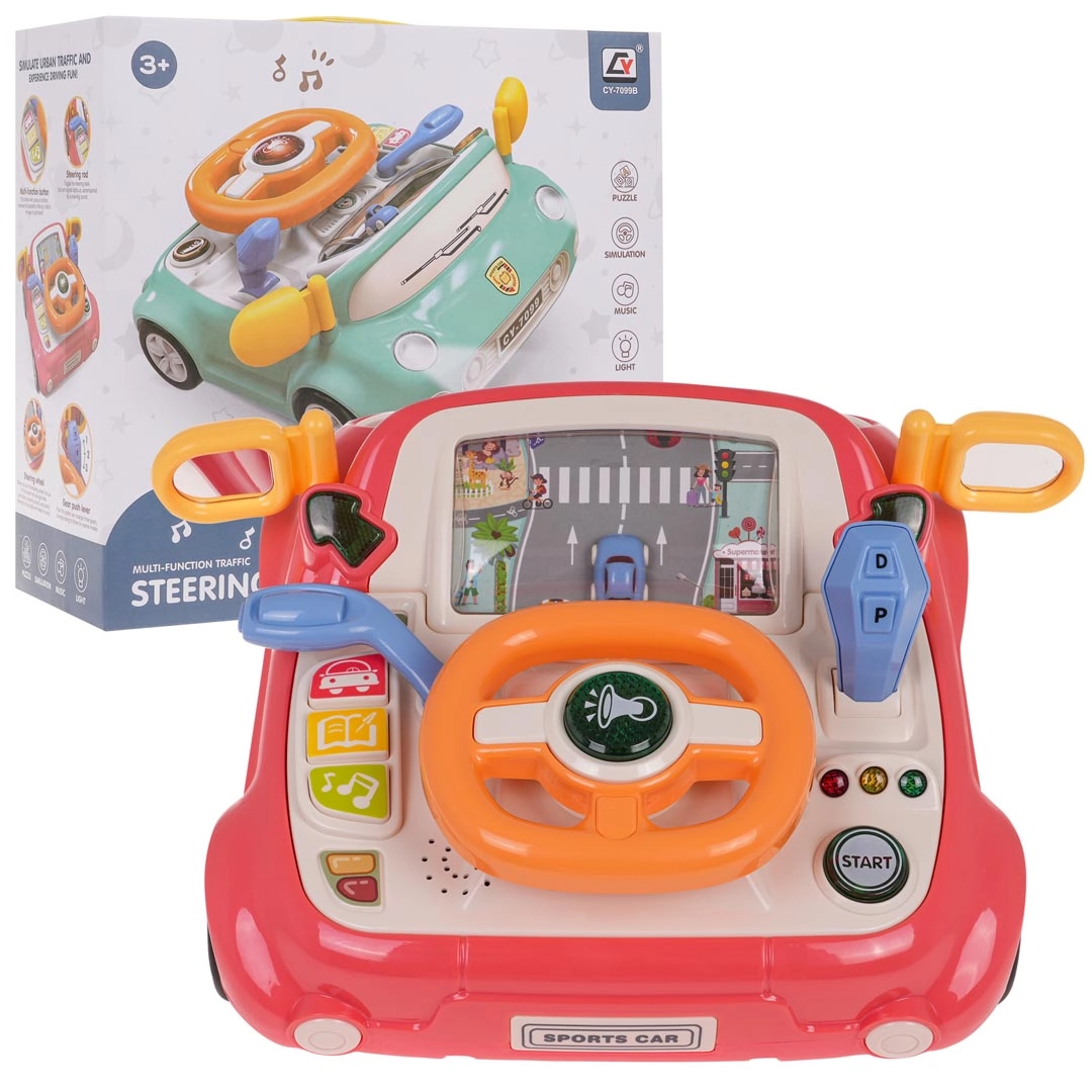 Leuk interactief speelgoed in de vorm van een autootje voor kinderen vanaf 3 jaar. Biedt licht- en geluidseffecten, een draaibaar stuur met verlichte claxon, een versnellingspook, richtingaanwijzers en een scherm met een bewegende weg en auto. Stevige uitvoering van hoogwaardige kunststof, zonder scherpe randen, met vier zuignappen voor stabiliteit en het spelenderwijs leren van verkeersregels.