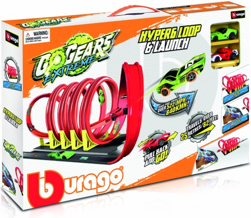 De Bburago GoGears Extreme racebaan is een perfecte keuze voor kinderen die van snelheid en spectaculaire hindernissen houden. Dankzij de zes loopings en de ramp ontstaat een dynamische baan vol uitdagingen, waar je sprongen en topsnelheid kunt uitproberen. In de verpakking zitten twee supersnelle autootjes die na het opwinden tot wel 25 meter kunnen rijden.